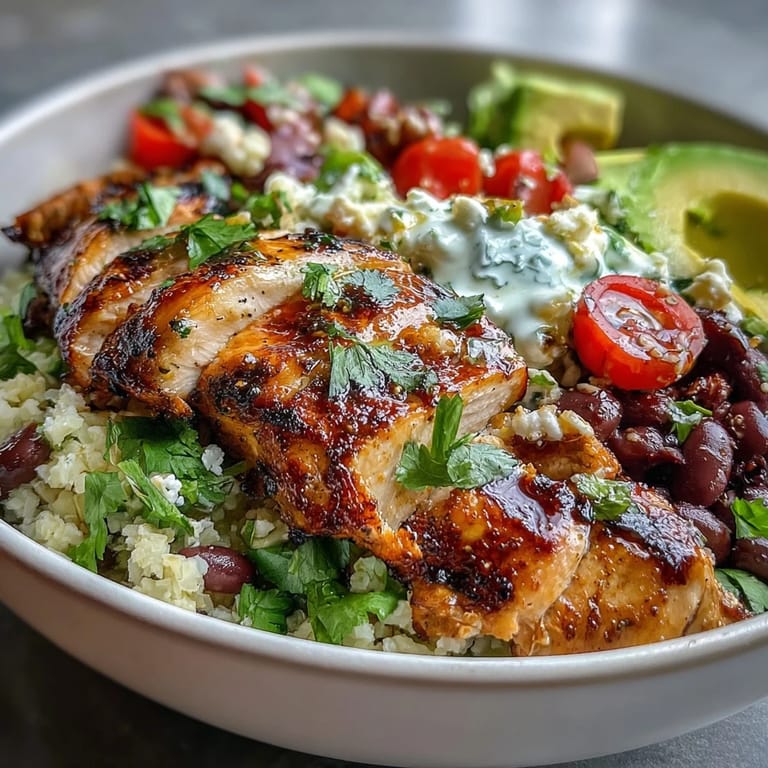 - Start with your warm cauliflower rice as the base, then arrange your warm chicken, black beans, cherry tomatoes, red onion, and avocado on top in whatever pattern makes you happy. Drizzle with that tablespoon of Greek yogurt, scatter fresh cilantro over everything, and squeeze your lime wedge over the whole thing.