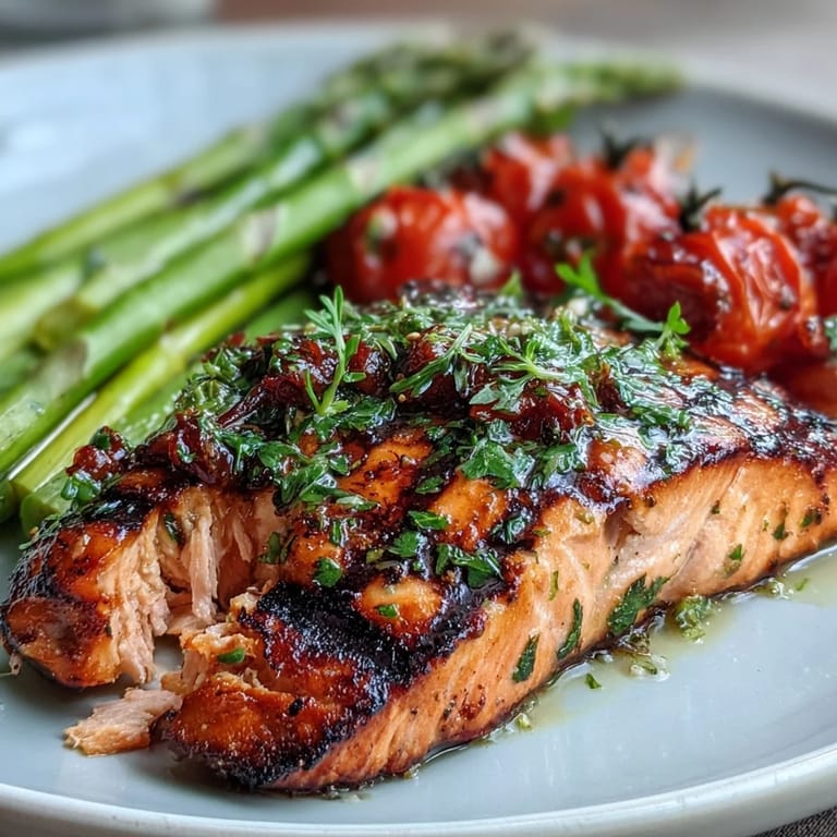 Pin It Imagine the sizzle of fresh salmon hitting a hot grill, the aroma of lemon and herbs filling the air. This Grilled Lemon Herb Salmon with Asparagus and Cherry Tomatoes brings the essence of Mediterranean cooking to your table in just 30 minutes. The bright citrus notes of the marinade perfectly complement the rich, flaky salmon, while the charred asparagus and burst cherry tomatoes add color, texture, and nutrition to create a complete meal that feels both indulgent and wholesome.