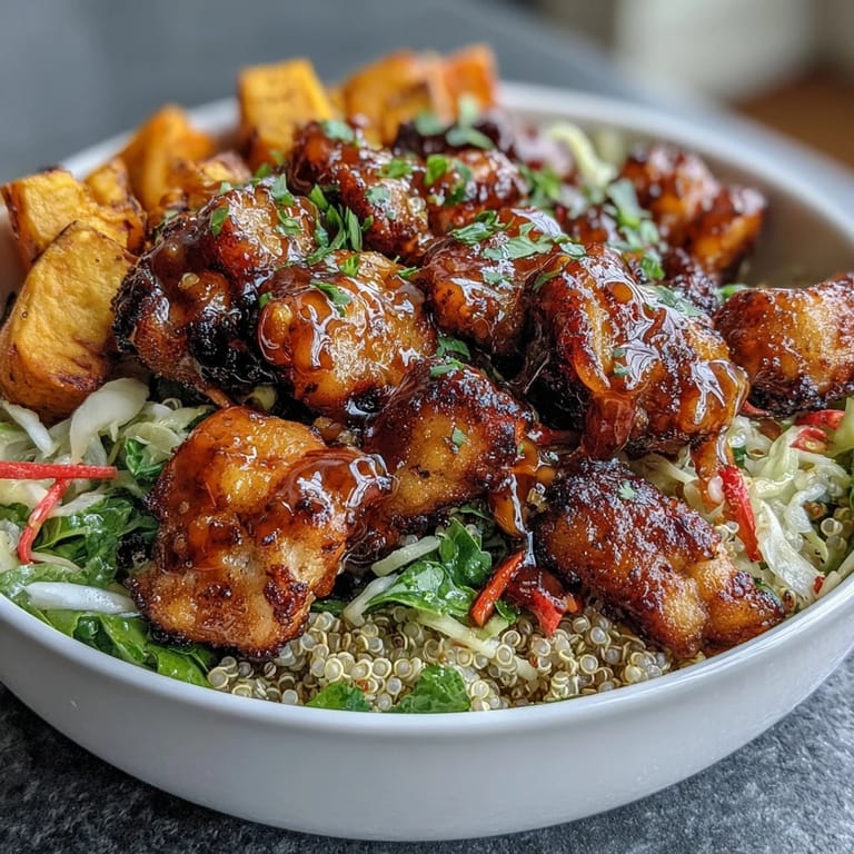 Pin It Experience a vibrant and nourishing meal with this Hot Honey Chicken Bowl, a perfect example of American Fusion. This dish brings together smoky spiced chicken, caramelized roasted sweet potatoes, and a refreshing red cabbage slaw, all served over a bed of fluffy quinoa. The highlight is the tangy hot honey mustard dressing that adds a bold and addictive kick to every bite, making it a high-protein and gluten-free favorite.
