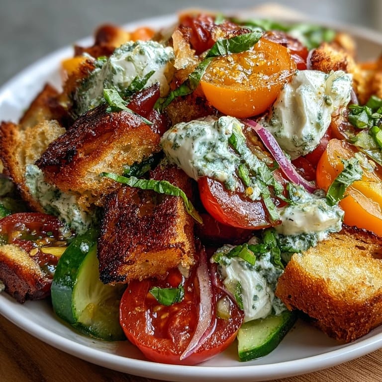 Pin It There's a moment every summer when I realize I have a half loaf of sourdough sitting on the counter and the farmers market has delivered the most impossibly vibrant heirloom tomatoes—some striped like candy, others deep purple-red. That's when panzanella stops being just a recipe and becomes an excuse to celebrate what the season has handed me. This salad came together one humid afternoon when I wanted something that felt substantial but didn't require heating up the kitchen, and the combination of crispy bread, sweet tomatoes, and a basil vinaigrette so green it practically glows became an instant tradition.