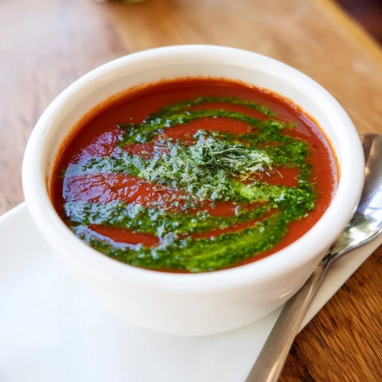 Pin It The smell hit me first, a deep tomato sweetness mingling with garlic, before I even stepped through the kitchen door. My neighbor was testing her grandmother's soup recipe, and I happened to drop by at exactly the right moment. She ladled me a bowl, then spooned a bright green swirl across the top. That single taste taught me something important: tomato soup didn't have to be plain or predictable.